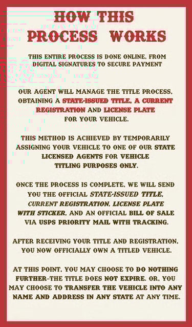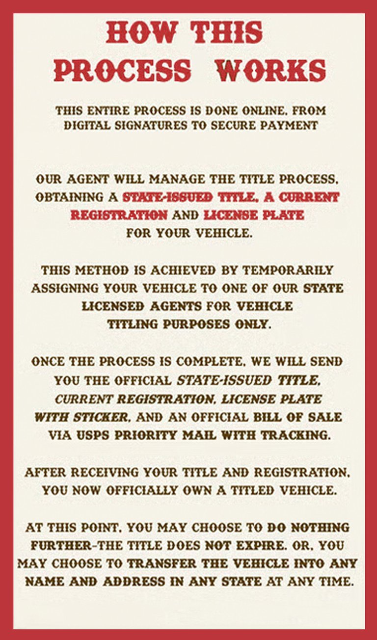 Vintage Motor Titles, we accept payment only by credit or debit card. This gives you 120 days of refundable buyer protection for your peace of mind. If we don’t deliver exactly what we promise, simply contact your credit card company and request to have the charge removed —Simple, safe, and stress-free.